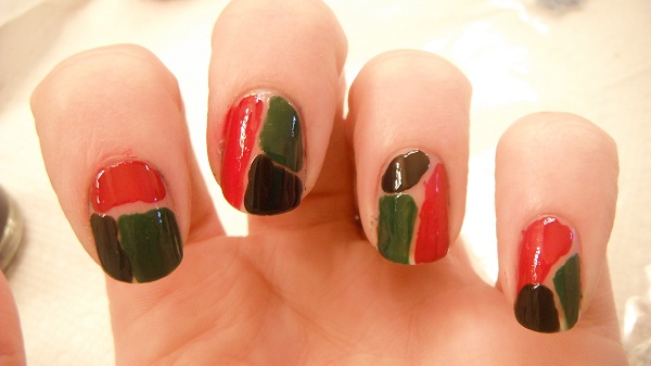 Stained glass nail art is a really easy look to achieve. Pick 3 or 4 nail polish colors to be the “glass” and one color to use as the “lead.” Using either a small paint brush or a nail art brush, apply one color at a time into small triangles breaking up each nail into different areas.